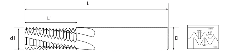 | পিচ | মোটা দাঁত ইউএনসি | সূক্ষ্ম দাঁত ইউএনএফ | ব্লেড ব্যাস d1 | কার্যকর ফলক দৈর্ঘ্য এল1 | ব্যাস হ্যান্ডেল ডি | সামগ্রিক দৈর্ঘ্য L | ব্লেড কাউন্ট | নীচের গর্ত ব্যাস |